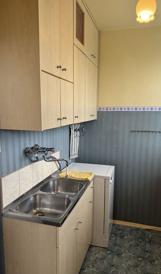 W kuchni zamontowana jest nowoczesna, jasna zabudowa, natomiast w przedpokoju i łazience znajdują się panele oraz płytki starszego typu.