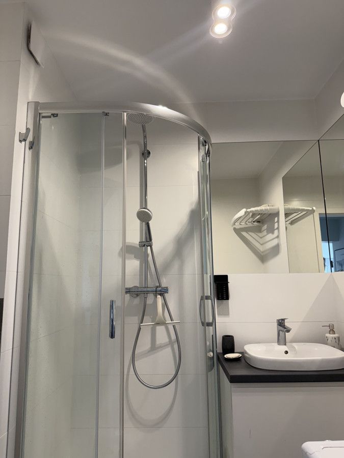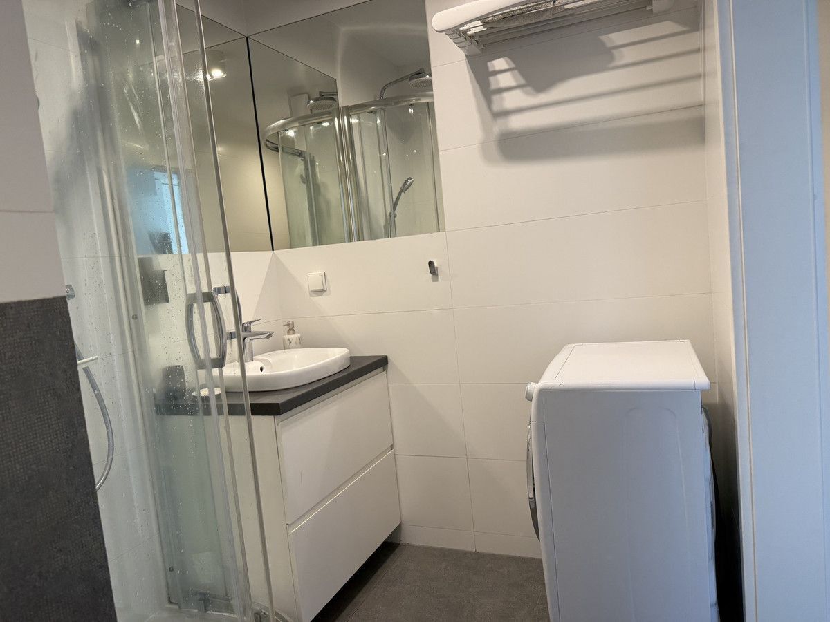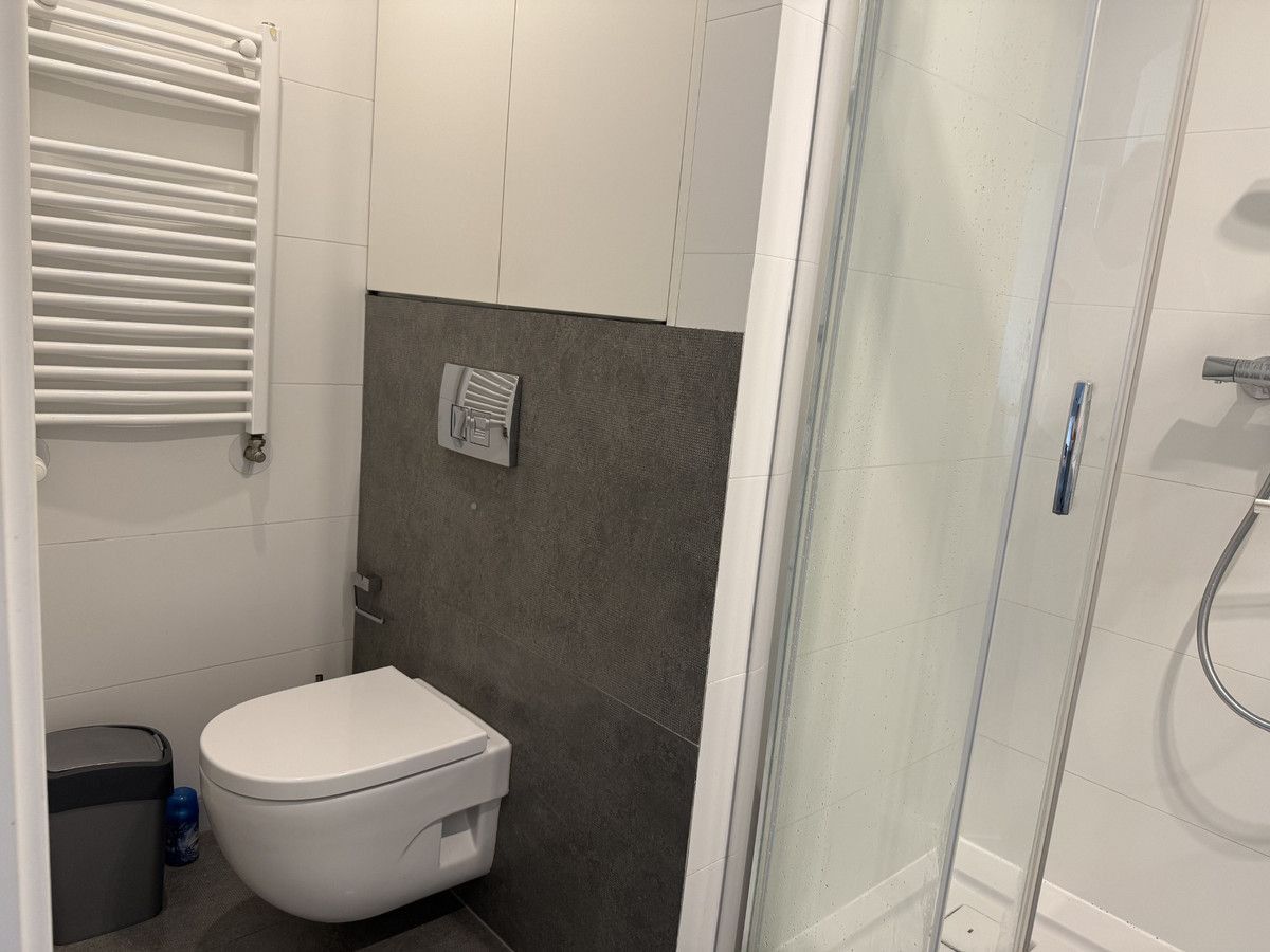 Elegancka, z prysznicem i deszczownicą, WC, umywalką oraz pralko-suszarką.