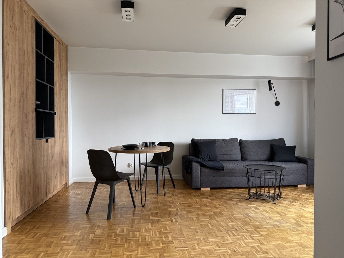 Przestronny i jasny, z wygodną rozkładaną sofą, stołem z krzesłami, pojemną szafą i szafkami.